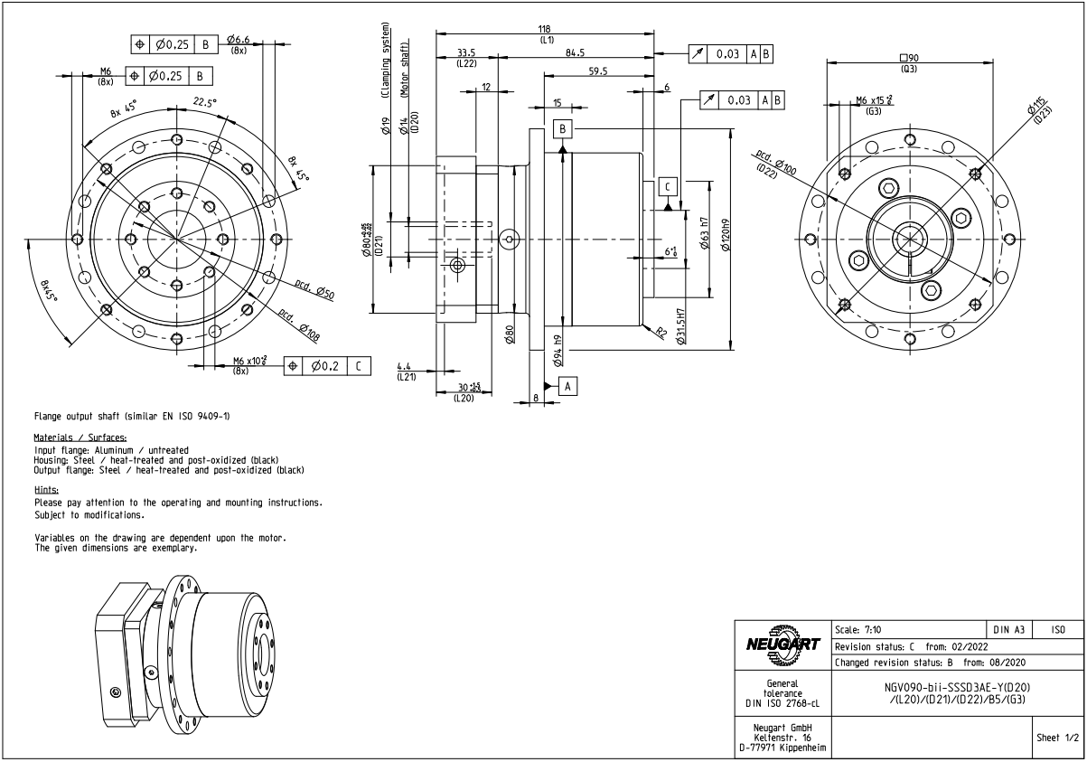 NGV planetary gearbox is a gearbox designed by NEUGART for industrial ground transportation vehicles. This gearbox has a compact structure and strong bearing capacity, and is suitable for high radial loads. AGV automatic guided vehicles have high requirements for radial load, space utilization and uninterrupted operation throughout the day. On this basis, the design concept of the special output bearing adopted by our NGV planetary gearbox can be directly installed on the chassis of the vehicle, so it may well meet these needs. This NGV planetary gearbox is used in industries such as ground transport vehicles, unmanned trucks, logistics trucks and robot handling. Professional technology provides selection and drawings. The following are the standard model size drawings of NGV gearboxs, which are only for selection reference!NGV64減速機(jī)圖紙.pngNGV64 gearbox drawing